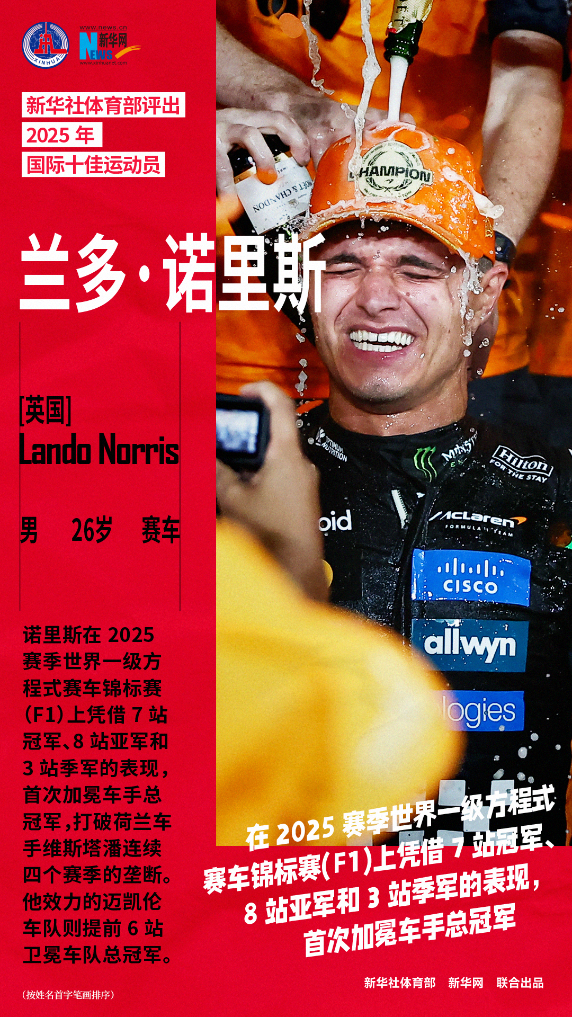 诺里斯在2025赛季世界一级方程式赛车锦标赛(F1)上凭借7站冠军、8站亚军和3站季军的表现,首次加冕车手总冠军,打破荷兰车手维斯塔潘连续四个赛季的垄断。他效力的迈凯伦车队则提前6站卫冕车队总冠军。