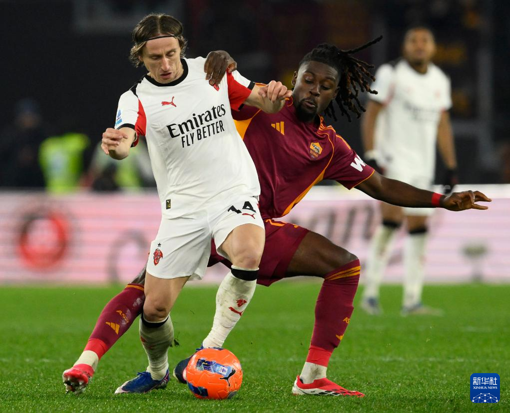 1月25日,罗马队球员科内(右)与AC米兰队球员莫德里奇在比赛中拼抢。