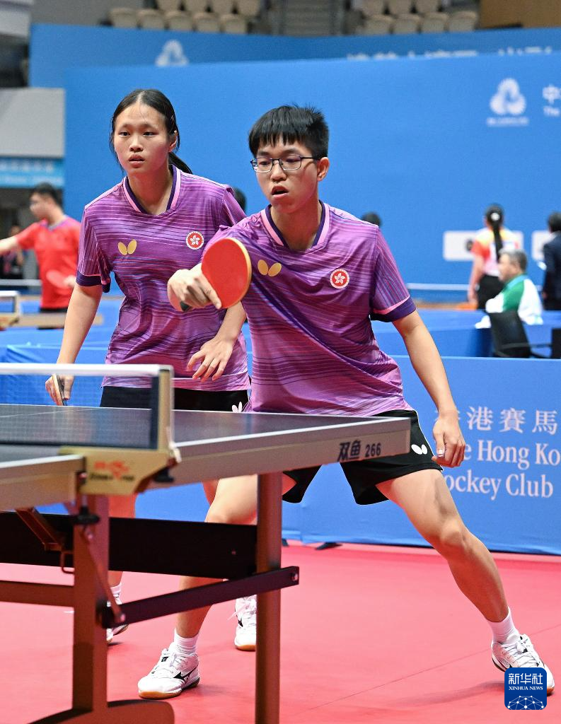 12月8日,澳门二团队组合梁润林(左)/何梓柔在与广东二团队组合邓嘉辉/陈宁的F组比赛中。最终,邓嘉辉/陈宁获得F组冠军,梁润林/何梓柔获得F组季军。