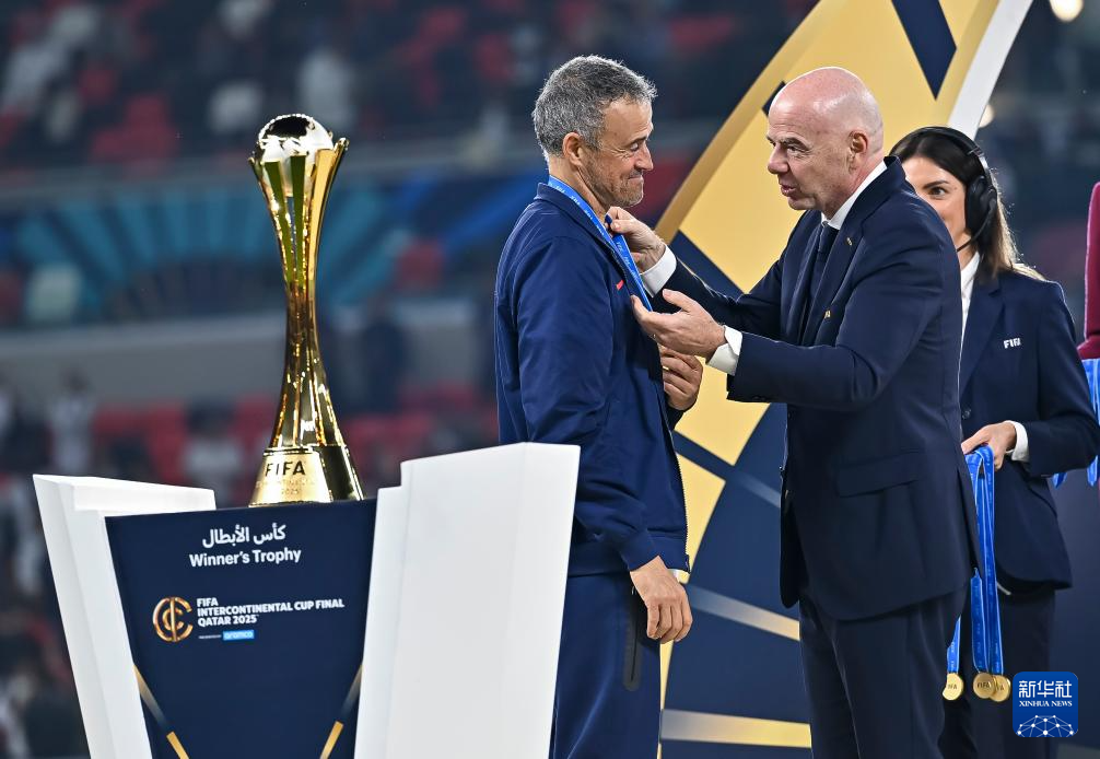 12月17日,国际足联主席因凡蒂诺(前右)在颁奖仪式上为巴黎圣日耳曼队主教练恩里克(前左)颁发奖牌。