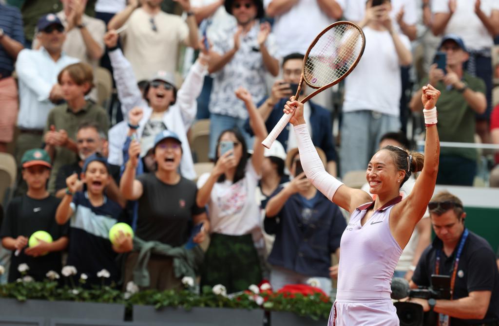 6月1日,郑钦文庆祝职业生涯首次打进法网女单八强。体育日报记者 高静 摄