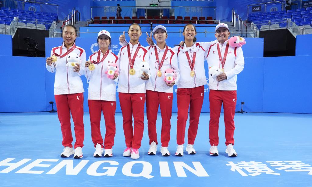 11月12日,在横琴进行的第十五届全国运动会网球项目青年组女子团体决赛中,冠军北京队在颁奖仪式后合影。体育日报记者 颜麟蕴 摄
