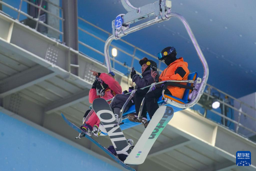 12月25日,滑雪爱好者在长春万达滑雪场乘坐缆车。