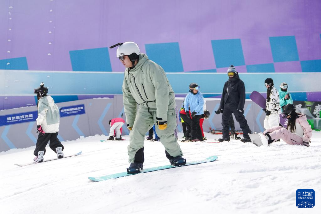12月25日,滑雪爱好者在长春万达滑雪场内进行热身。