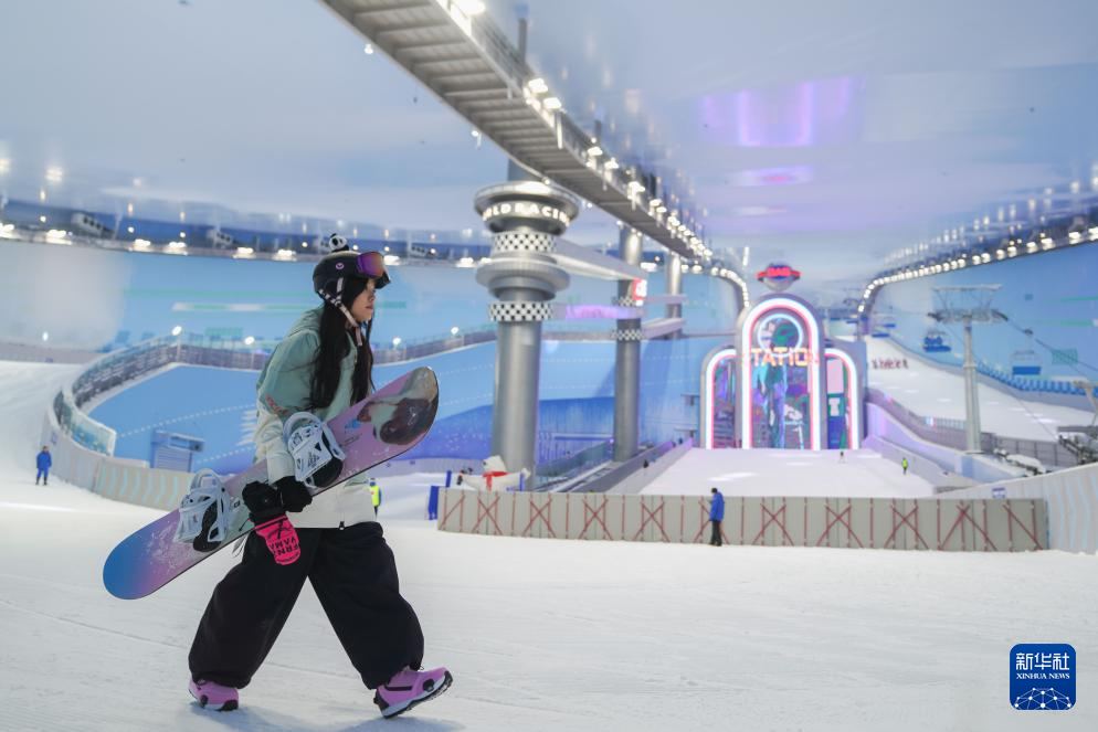 12月25日,滑雪爱好者行走在长春万达滑雪场内。