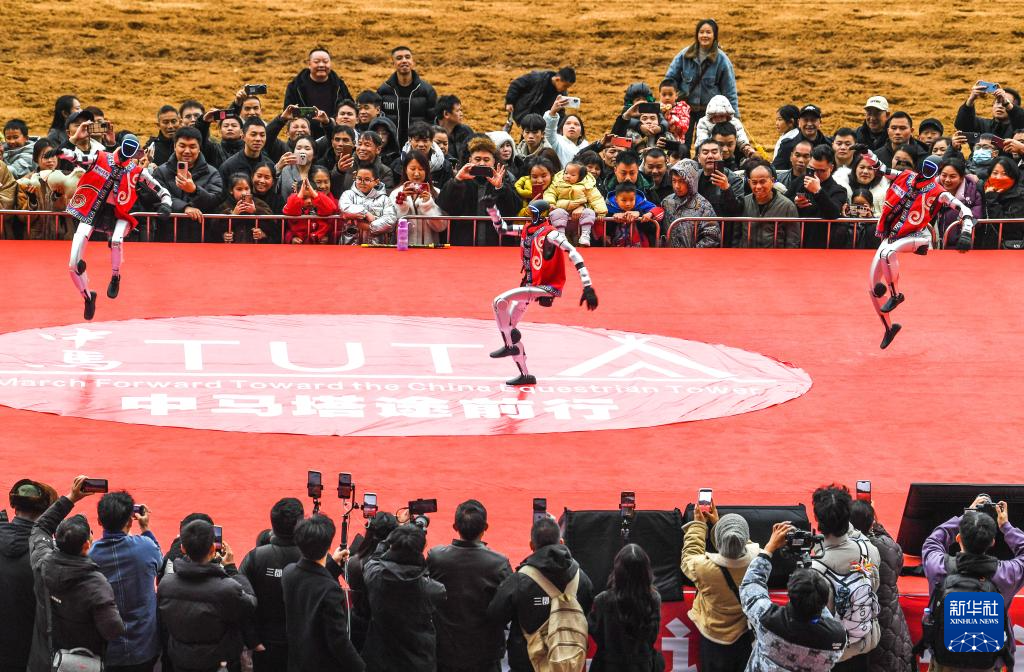 1月1日,机器人在贵州省三都水族自治县举行的“村马”比赛间隙表演节目。
