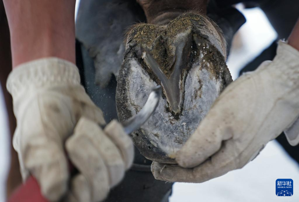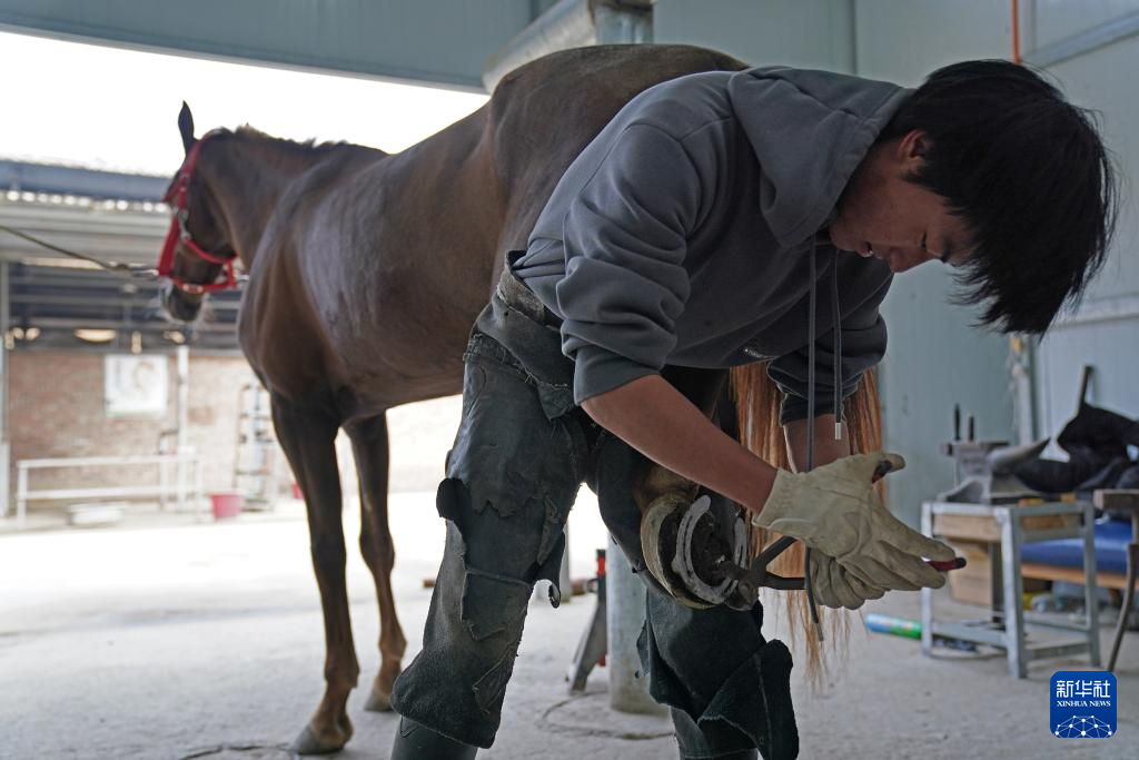 高二学生邹国成在给马钉掌(2025年12月23日摄)。体育日报记者 万象 摄