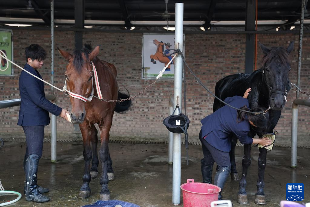 马术班学生在训练后清洗马匹(2025年12月23日摄)。体育日报记者 万象 摄