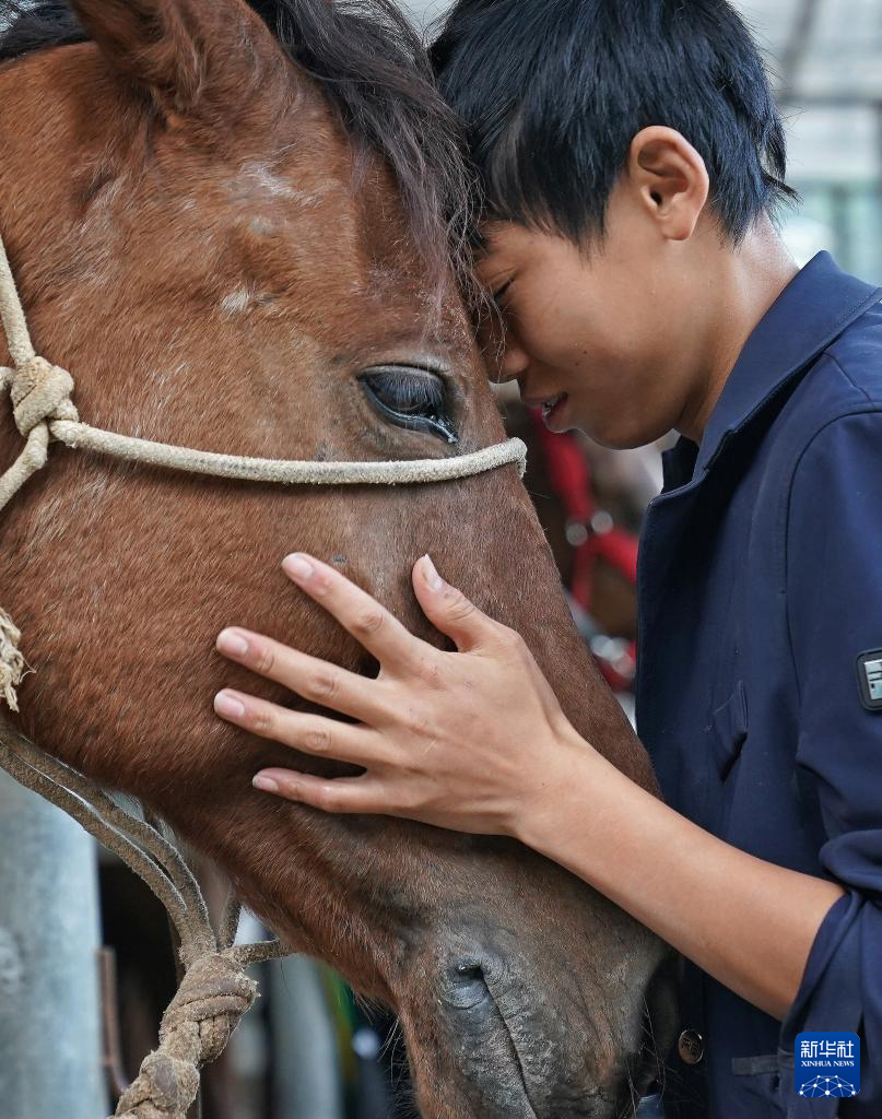 高一学生吴天昊在训练后与赤兔(马名)交流感情(2025年12月23日摄)。体育日报记者 万象 摄
