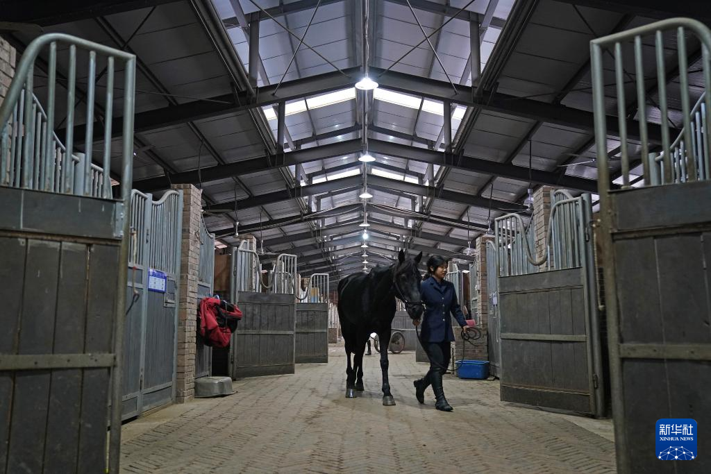 高三学生王燕琪给“黑豹”(马名)清洗后,将其牵回马厩休息(2025年12月23日摄)。体育日报记者 万象 摄
