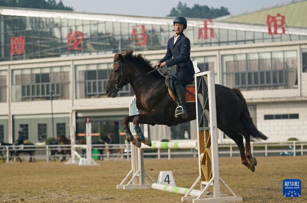 高二学生邹国成在训练场上练习马术跨栏(2025年12月23日摄)。体育日报记者 万象 摄