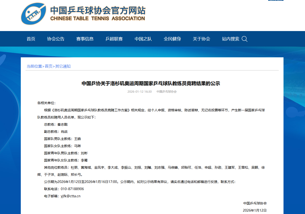 体育日报北京1月12日热讯 中国乒协官网12日公示洛杉矶奥运周期国家乒乓球队教练员竞聘结果,拟聘秦志戬为总教练、肖战为副总教练。