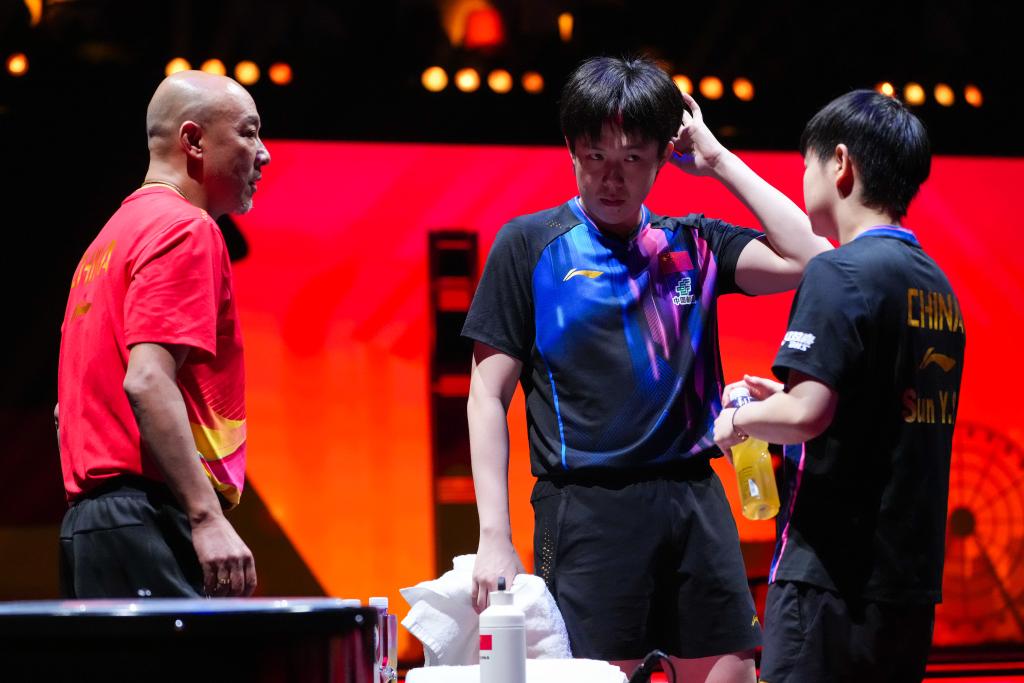 2025年12月12日,中国队教练肖战(左)在比赛暂停时指导王楚钦(中)/孙颖莎。当日,在香港进行的2025年世界乒乓球职业大联盟(WTT)总决赛混双小组赛中,中国组合王楚钦/孙颖莎3比2战胜中国香港组合黄镇廷/杜凯琹。体育日报记者 朱炜 摄