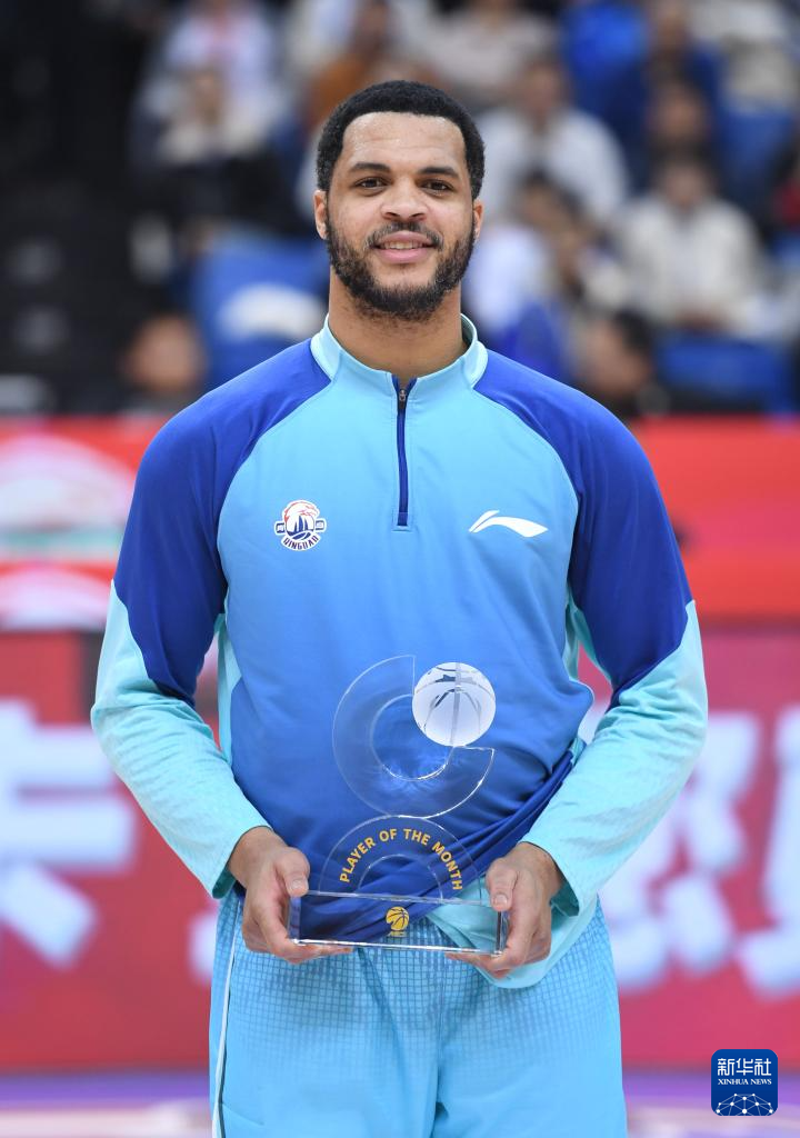 1月15日,青岛崂山啤酒队球员韦瑟斯庞在赛前接受“月度最佳球员”奖。