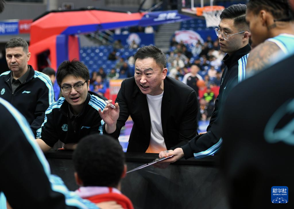 1月15日,青岛崂山啤酒队主教练刘维伟(中)在比赛中向队员布置战术。