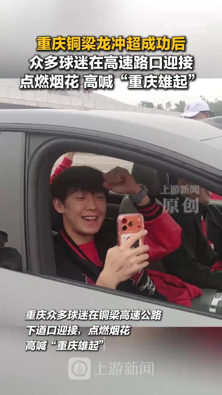 众多球迷在高速路口迎接重庆铜梁龙,点燃烟花高喊“重庆雄起”