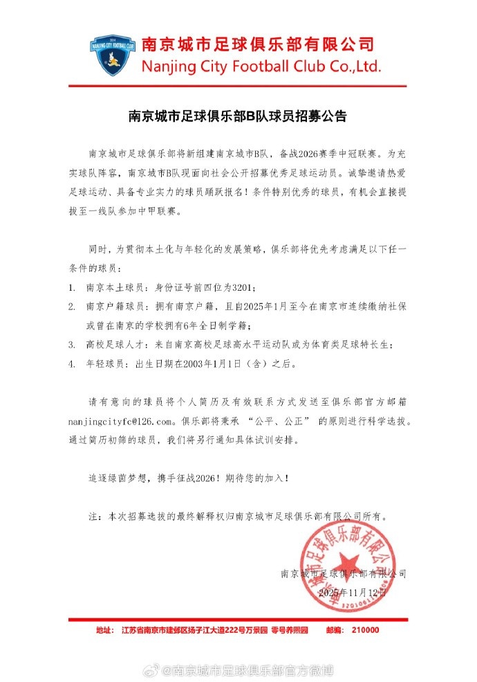 南京城市足球俱乐部B队球员招募公告