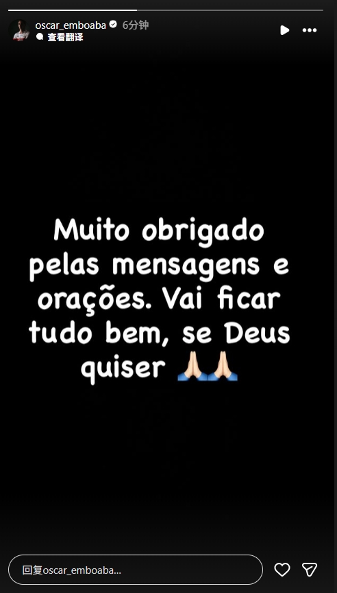 足球日报11月12日播报讯 在今日心脏出现异常送医后,奥斯卡首度更新社媒:非常感谢您的留言与祈祷。若上帝应允,一切自会好转????????