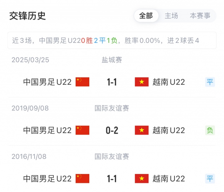 算上此前3场比赛,近四次交手,国足U22对阵越南2平2负难求一胜。