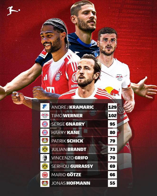 北京时间12月18日德甲日报,德甲官方列出了现德甲进球数最多的10名球员,目前效力于霍芬海姆的克拉马里奇以129球排名第一,维尔纳102球第二,格纳布里95球第三,哈里-凯恩、希克、布兰特、吉拉西以及格策上榜。