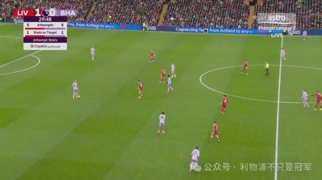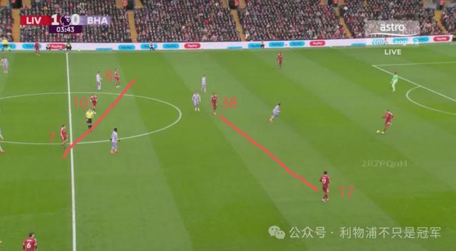 有球进攻时,维尔茨依然前插,麦卡利斯特适当后撤。无论攻防,利物浦的阵型都基本上是433。