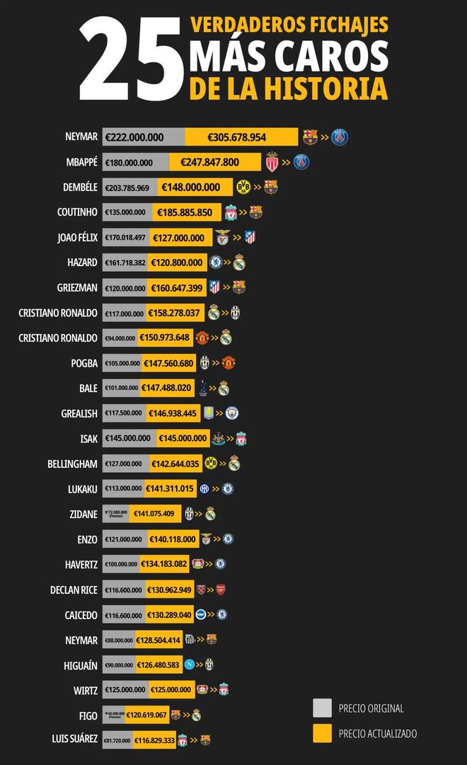 Betfair重新计算世界足坛历史最贵的25笔交易: