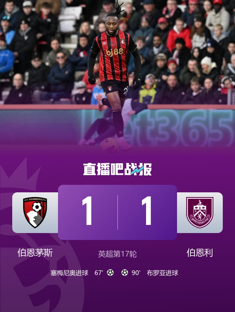 终结英超7连败!伯恩利1-1伯恩茅斯 布罗亚90分钟绝平塞梅尼奥破门