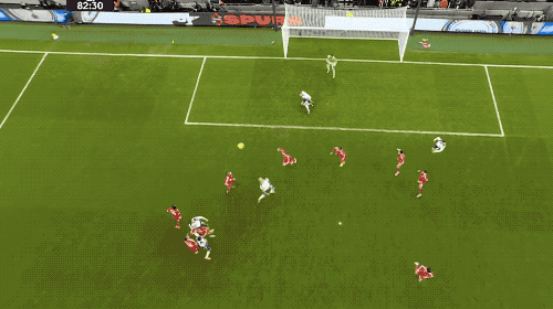 第37分钟,居莱尔的传中落点精准,贝林厄姆在干套之下头球破门,打破僵局。