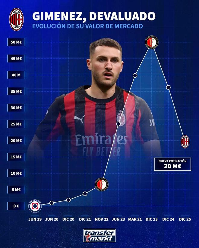 现年24岁的圣地亚哥-希门尼斯今年2月以3020万欧元的价格从费耶诺德转会至米兰,不过本赛季至今他代表红黑军团出场11次,仅仅贡献1球1助攻。