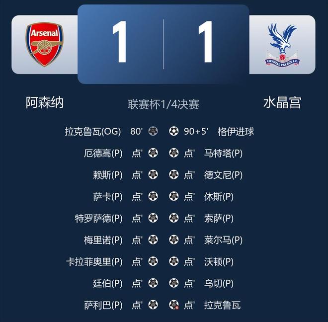 点球大战上演了极致的紧张与刺激。双方前七轮球员弹无虚发,从厄德高、赖斯到马特塔、莱尔马,每一位站在十二码前的球员都展现了过硬的心理素质。直到第八轮,命运的天平终于倾斜:萨利巴冷静命中为阿森纳锁定优势,而再次站上点球点的拉克鲁瓦未能完成自我救赎,凯帕的神扑让水晶宫的顽强抵抗戛然而止。不过令人反思的是阿森纳全场25射仅靠乌龙破门,锋线终结能力的低迷显而易见。