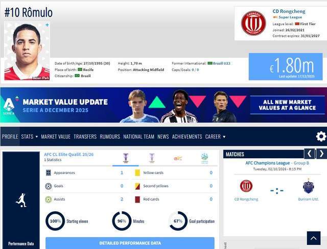 不过,罗慕洛是目前最值得国足归化的外援。2021年2月加盟成都蓉城以来,他即将在明年2月满5年,而他正是国足最需要的中场大师,为成都蓉城5年来贡献37球34助攻,独造71球,成都蓉城也是他职业生涯最成功的俱乐部。