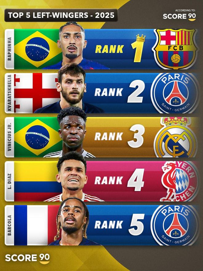 北京时间12月31日法甲日报,Score90公布了根据他们的数据统计选出的2025年五大前锋,其中左边锋第一是拉菲尼亚, 右边锋第一是亚马尔,中锋第一是姆巴佩。