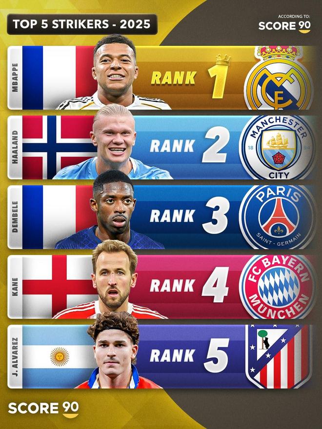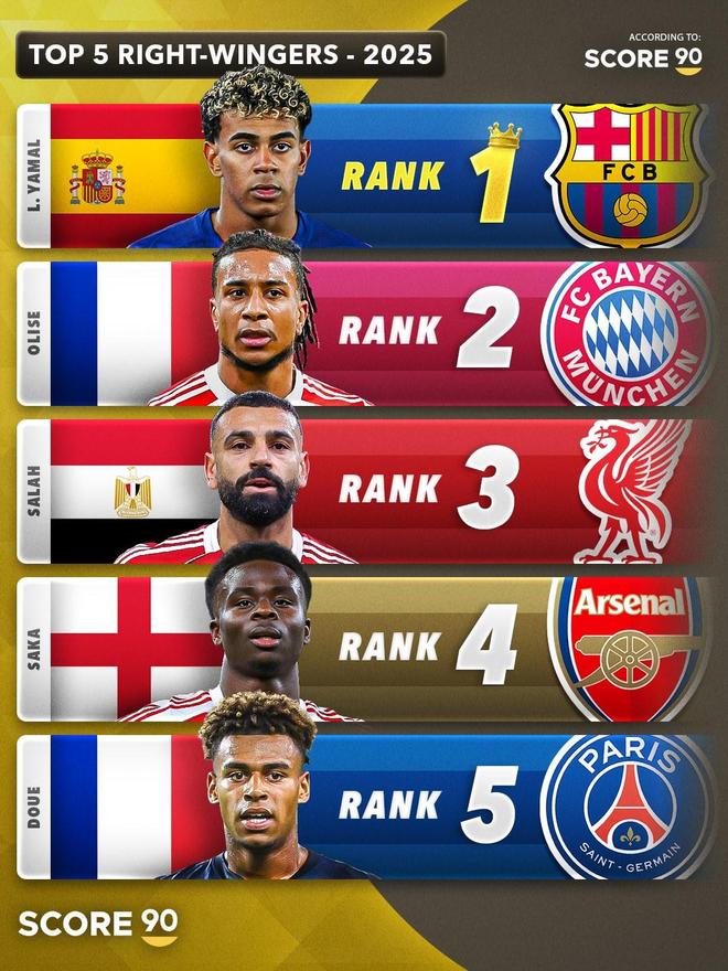 Score90评2025年五大前锋:拉菲尼亚、亚马尔、姆巴佩各位置居首