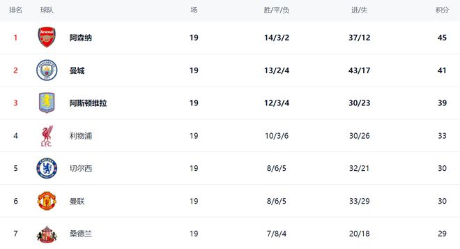 在积分榜上,阿森纳以45分排名榜首,战绩是14胜3平2负。曼城丢掉2分,总积分是41分,落后阿森纳4分。曼城争冠难度一下子变大了。阿斯顿维拉次轮输给阿森纳,依然是39分,排名第3,在争冠集团中有点掉队。利物浦33分排名第4。第5的是切尔西,拿到30分。曼联也是30分,排名第6。桑德兰这匹黑马以29分排名第7。热刺和纽卡斯尔联都是26分,排名第12和第13。