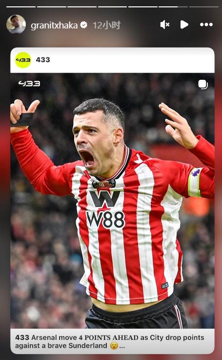 英超第19轮,桑德兰主场0-0战平曼城,阿森纳在积分榜上的领先优势达到4分。赛后,枪手旧将扎卡转发了阿森纳领先曼城4分的海报。