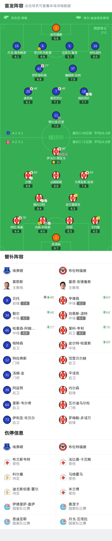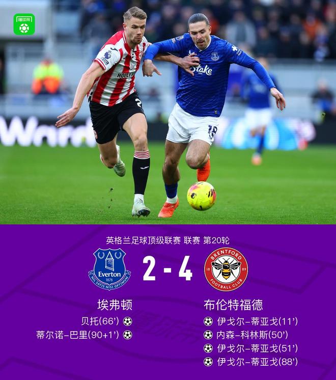 北京时间1月4日英超日报,英格兰足球超级联赛第20轮,埃弗顿坐镇主场迎战布伦特福德。比赛中,布伦特福德前锋伊戈尔-蒂亚戈完成帽子戏法,内森-科林斯建功。埃弗顿方面,格拉利什助攻双响,贝托、蒂尔诺-巴里破门。最终全场战罢,埃弗顿以2比4不敌布伦特福德。