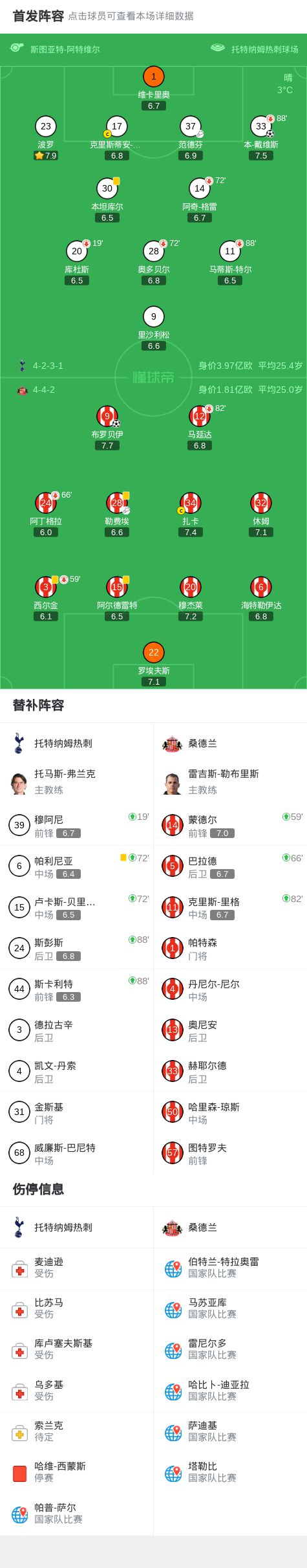 第19分钟,热刺被动调整,库杜斯伤退,穆阿尼替补上场