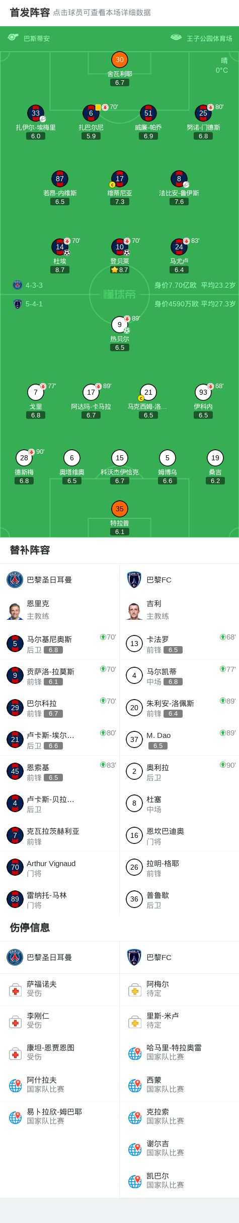 北京时间1月5日法甲日报法国足球顶级联赛联赛第17轮,巴黎圣日耳曼主场对阵巴黎FC。上半场拉菲尼亚远射滑门而出,杜埃爆射破门,下半场热贝尔点射扳平,登贝莱兜射变线得分。最终比分巴黎圣日耳曼2-1巴黎FC。