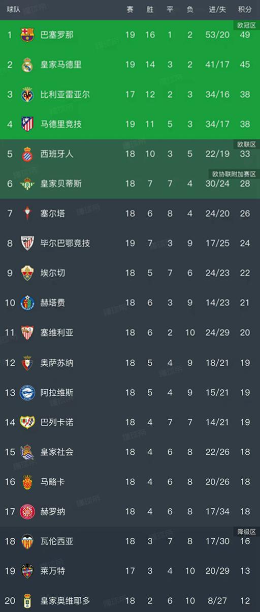 北京时间1月5日西甲日报,随着皇马5-1皇家贝斯,马竞1-1皇家社会,马略卡1-2赫罗纳、阿拉维斯1-1皇家奥维耶多、莱万特3-0塞维利亚的比赛结束,西甲第18轮结束了所有比赛,最新排名如下!