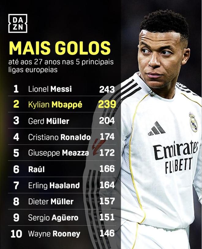 姆巴佩27岁生日这天,Dazn Football发了一张对比图:把“截至27岁这一天为止”的五大联赛联赛进球直接拉到历史坐标里看。梅西243球排第1,姆巴佩239球排第2,只差4球贴在身后;更让人意外的是,C罗在这张榜单里只排第4,27岁节点的联赛进球是174球。哈兰德同样让人眼前一亮,虽然只有25岁,但他已经上榜,并且高居第七。下面就是这份“27岁前五大联赛联赛进球最多”的完整排名。