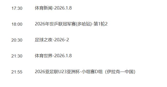 北京时间1月8日足球日报22:00,2026亚足联U23亚洲杯小组赛D组首轮,中国U23队迎战伊拉克U23队。1月7日,央视最新节目单显示,央视体育频道(CCTV5)将从21:55开始,聚焦直播这场比赛。