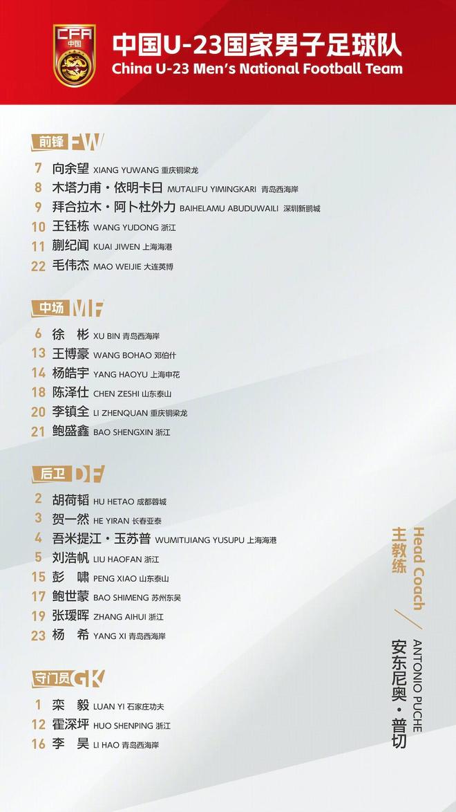 去年的U20亚洲杯,中国队遗憾止步1/4决赛,未能得到U20世界杯的参赛资格,那支队伍里,王钰栋、蒯纪闻、毛伟杰、陈泽仕、贺一然、彭啸、杨希将随队参加本届U23亚洲杯。