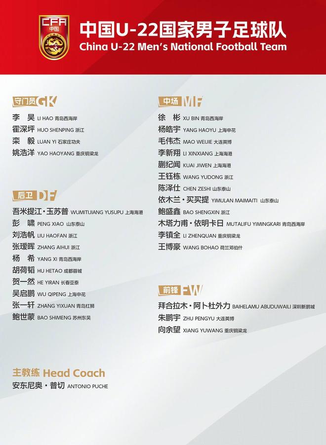 这支中国U23队的领军人物是队内年龄最小的、年仅19岁的浙江队前锋王钰栋。上赛季,王钰栋在中超攻入了11粒进球,是进球最多的本土球员。王钰栋此前已经完成成年国家队出场,代表国足在十二强赛的收官战点球绝杀巴林,攻入国家队生涯首球。去年9月的预选赛阶段,王钰栋3场3球3助攻,他对于这支球队来说依然是不可或缺的王牌。