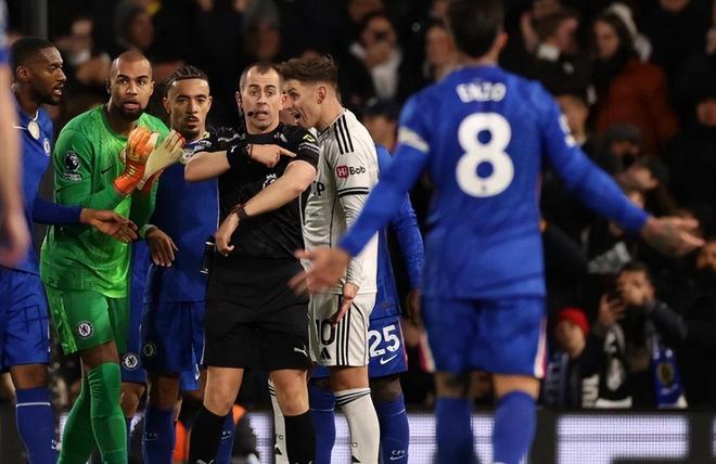 比赛开始后切尔西立马主动进攻,第9分钟恩佐开出角球直接旋到门前,莱诺不敢怠慢将球挡出;第20分钟,恩佐再次角球造险,凯塞多跟进补射被封堵;第22分钟,场上风云突变,哈里-威尔逊高速前插即将形成单刀,库库雷利亚不得已拉人犯规,因为是破坏绝佳的单刀机会,西班牙边卫被红牌直接罚下;切尔西本赛季英超已领到五张红牌,队史单赛季仅次于2007-08赛季。恩佐和帕尔默都因为不满吹罚也被出示了黄牌;少一人作战切尔西进攻直接哑火,场面也逐步被动,半场结束前,劳尔-希门尼斯回做,哈里-威尔逊劲射破门,不过越位在先进球无效。