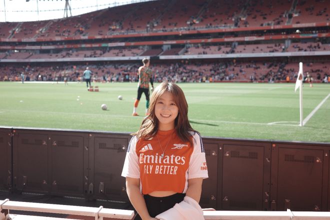 A:我叫菲菲,是一名95后女球迷,出生在山东济南。我的俱乐部主队是阿森纳,因为现在在伦敦工作,所以每到世界杯或大赛,我也会选择支持英格兰。我和足球的最初记忆其实非常生活化。小时候的夏夜,会跟着爸爸去济南的烧烤摊看世界杯,老电视、小板凳,还有一群陌生却因为足球迅速热络起来的大人们。现在回想起来,那些画面都还是特别珍贵的记忆。中学时,班里大部分同学都是皇马和C罗的球迷,每天都能听到朋友们聊足球,我们也会一起去看山东泰山的主场比赛。上大学之后,我更多是看世界杯和欧洲杯,不太会熬夜追联赛。直到去英国读书,才和室友们一起关注英超的各种动向。但真正的转折点,是去年正式来到伦敦工作,我才开始尽量一场不落地走进球场支持自己的主队。截至目前,我已经在现场看过45场比赛,这种连接是过去十几年隔着屏幕无法比拟的。我想我这辈子都会是阿森纳球迷了。