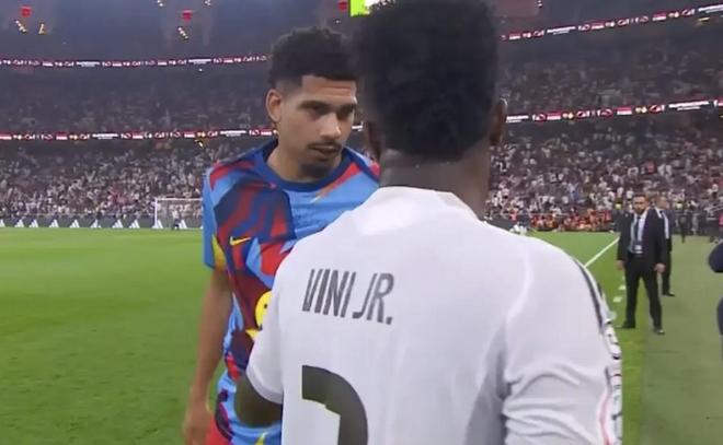 友好,西超杯中场休息时维尼修斯与阿劳霍亲切交流