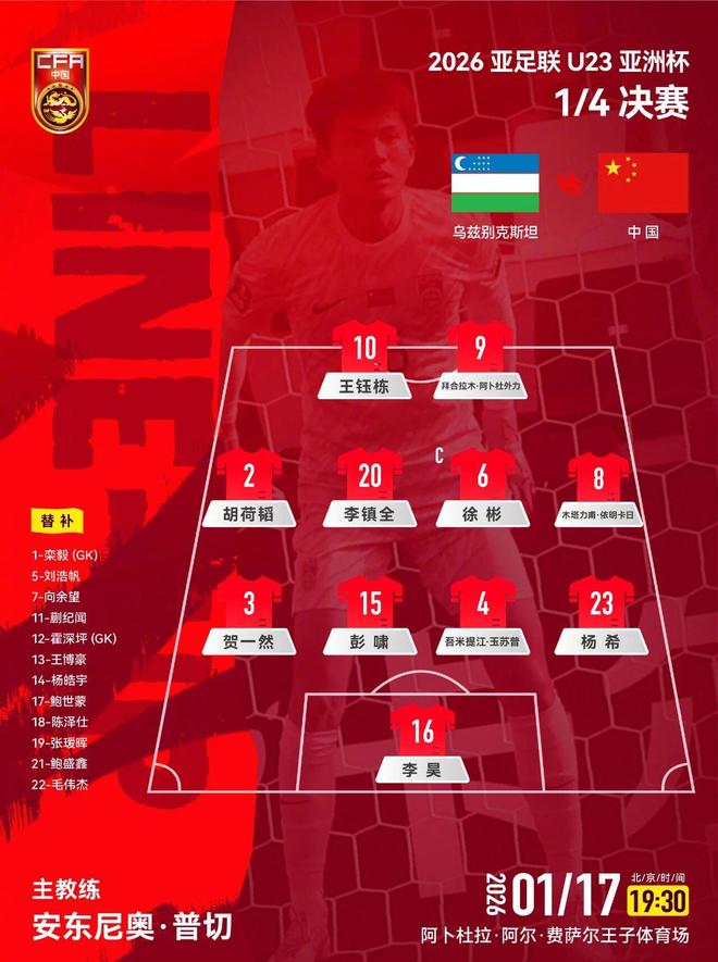 在此前的小组赛中,U23国足凭借着1胜2平的不败战绩,以小组第二的身份历史性地晋级淘汰赛,对阵C组头名乌兹别克斯坦U23。本场首发方面相较于上一场,U23国足有两处调整,李镇全、杨希重回首发。