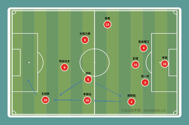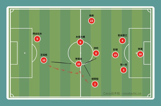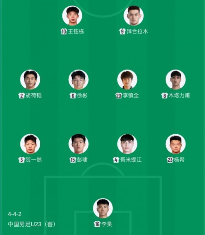 中国U23首发:16-李昊、2-胡荷韬、3-贺一然、4-吾米提江、15-彭啸、23-杨希、6-徐彬、20-李镇全、8-木塔力甫、9-拜合拉木、10-王钰栋