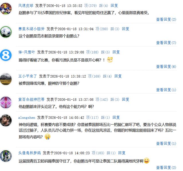 客观的说,赵鹏的观点是否可取暂且不表,但至少应该尊重他表达的权力。但是球迷非理性居多,由此吐槽倒也可以理解。更值得一提的是,赵鹏本人也是当年国足1比5惨败的受害者。那场比赛之后,范志毅接受采访时,范志毅表示,“你(国足)在合肥输个1比5,你倒告诉我怎么解释,脸都不要了。”当时,范志毅还点名批评了赵鹏,“中国足球现在什么水平,就这么几个人,你赵鹏什么的都在踢中卫,他能踢吗?踢不了,没这个能力知道吗?”