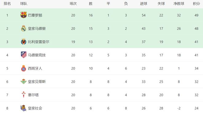 在积分榜上,输球的巴萨依然排名榜首。巴萨的战绩是16胜1平3负,拿到49分。皇马的劣势已经变得很小了,总积分是48分,只落后巴萨1分排名第2。皇马最快下一轮有希望超越巴萨登顶,当然,前提就是巴萨再次丢分。比利亚雷亚尔拿到41分,排名第3。赢球的马竞总积分也是41分,排名第4。西班牙人34分排名第5。
